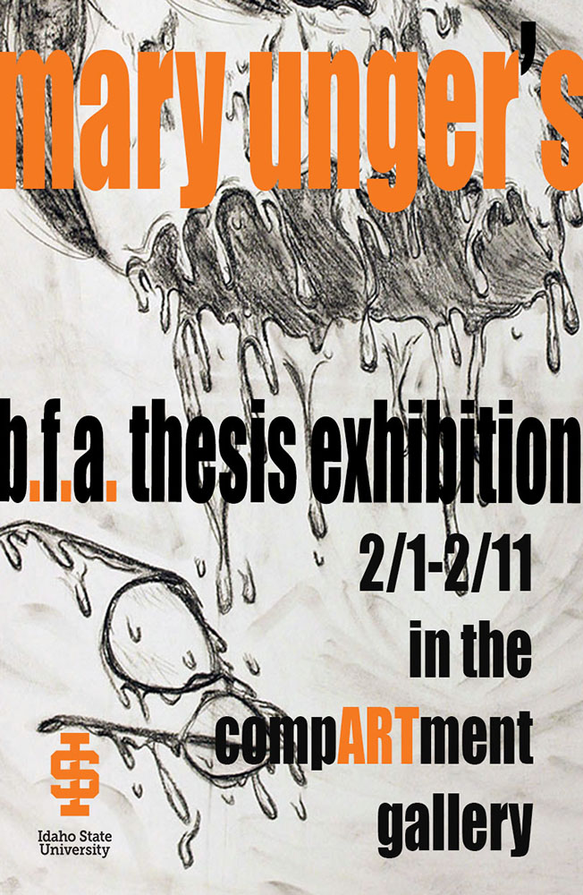 Mary Unger's B.F.A. Thesis Exhibition will be on display in the Compartment Gallery from February 1st to February 11th. The Compartment Gallery is located on the 4th floor of the Fine Arts Building room 408. The gallery is open Monday through Friday from noon to 6:00 pm.