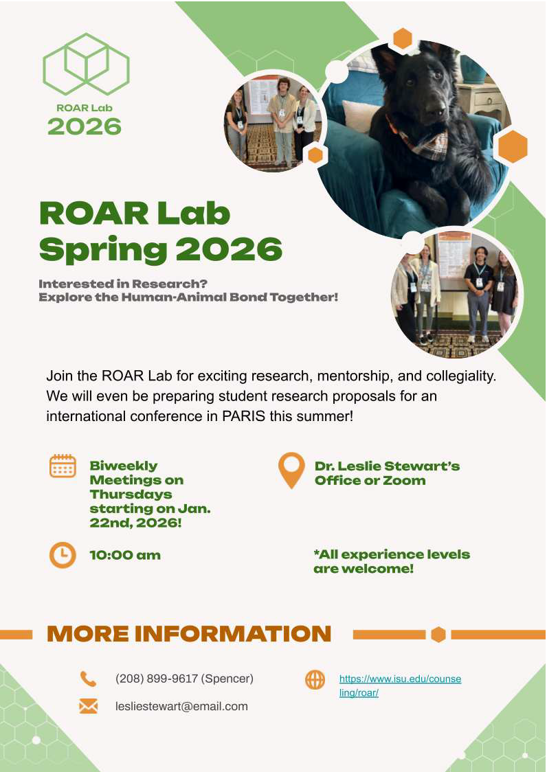 The Research on Anthrozoological Relationships (ROAR) Lab, housed within the Idaho State University Department of Counseling, is a collaborative team broadly focused on the topic of Anthrozoology. Anthrozoology is the multidisciplinary study of interactions and relationships between human and nonhuman animals that spans the humanities and the social, behavioral, and biomedical sciences. The mission of ROAR Lab includes producing and disseminating high-quality scholarly works, creating and implementing clinical and academic programs, advocating for ethical best practices and evidence-based standards, building community partnerships, and policymaking relevant to the human-animal bond in wellness. Further, founding director Dr. Leslie Stewart designed ROAR Lab to directly support and mentor scholarship in master’s students, doctoral students, and junior faculty. ROAR Lab meetings are hosted on a bi-weekly basis and strike a balance between scholarly productivity and fostering collegial social support among members. All interested students and faculty are invited to participate.