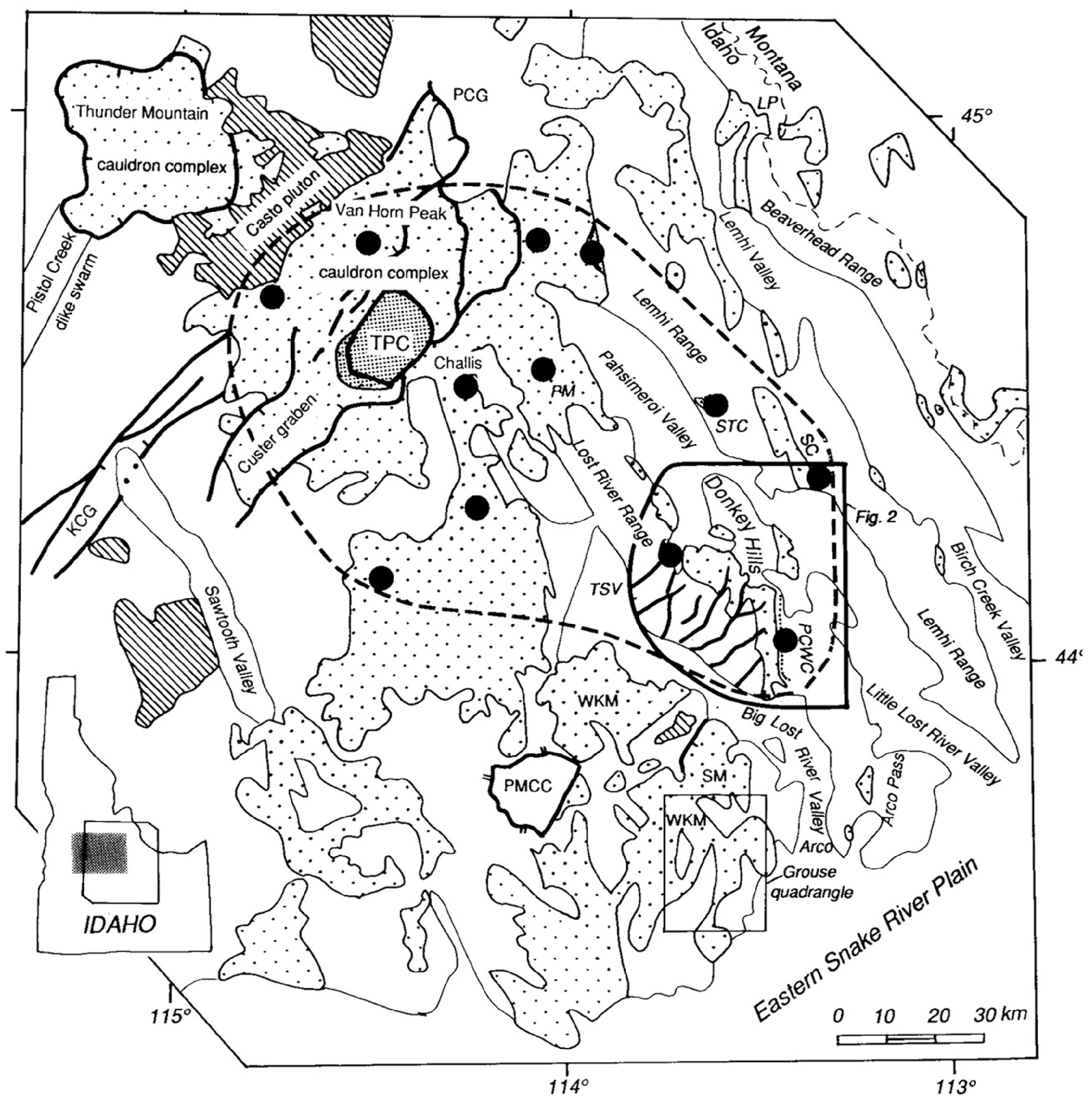 (Right/Below) Map of Challis volcanic field, Idaho, showing the distributions of volcanic rocks (coarse dots) and selected large plutons (diagonal rule). The tuff of Challis Creek in the Twin Peaks caldera (IPC) is shown with fine dots and exposures of the tuff outside the caldera are large solid dots. The presently known maximum extent of the tuff of Challis Creek is dashed. For clarity, only selected Eocene normal faults are shown. Abbreviations: PMCC=Pioneer metamorphic core complex; WKM=White Knob Mountains; TSV=Thousand Springs Valley; LP=Lemhi Pass; PCG=Panther Creek graben; PM=Pahsimeroi Mountains; STC-Stinking Creek; SC=Sawmill Canyon; KCG=Knapp Creek graben; SM=Sheep Mountain; and PCWC=Pass Creek-Wet Creek reentrant. Challis 1° x 2° sheet is shaded on index map. Sources: Bond (1978): Fisher (1985); Fisher et al. (1992): Hardvman (1985): Hardyman and Fisher (1985) (From Link and Janecke, 1999).