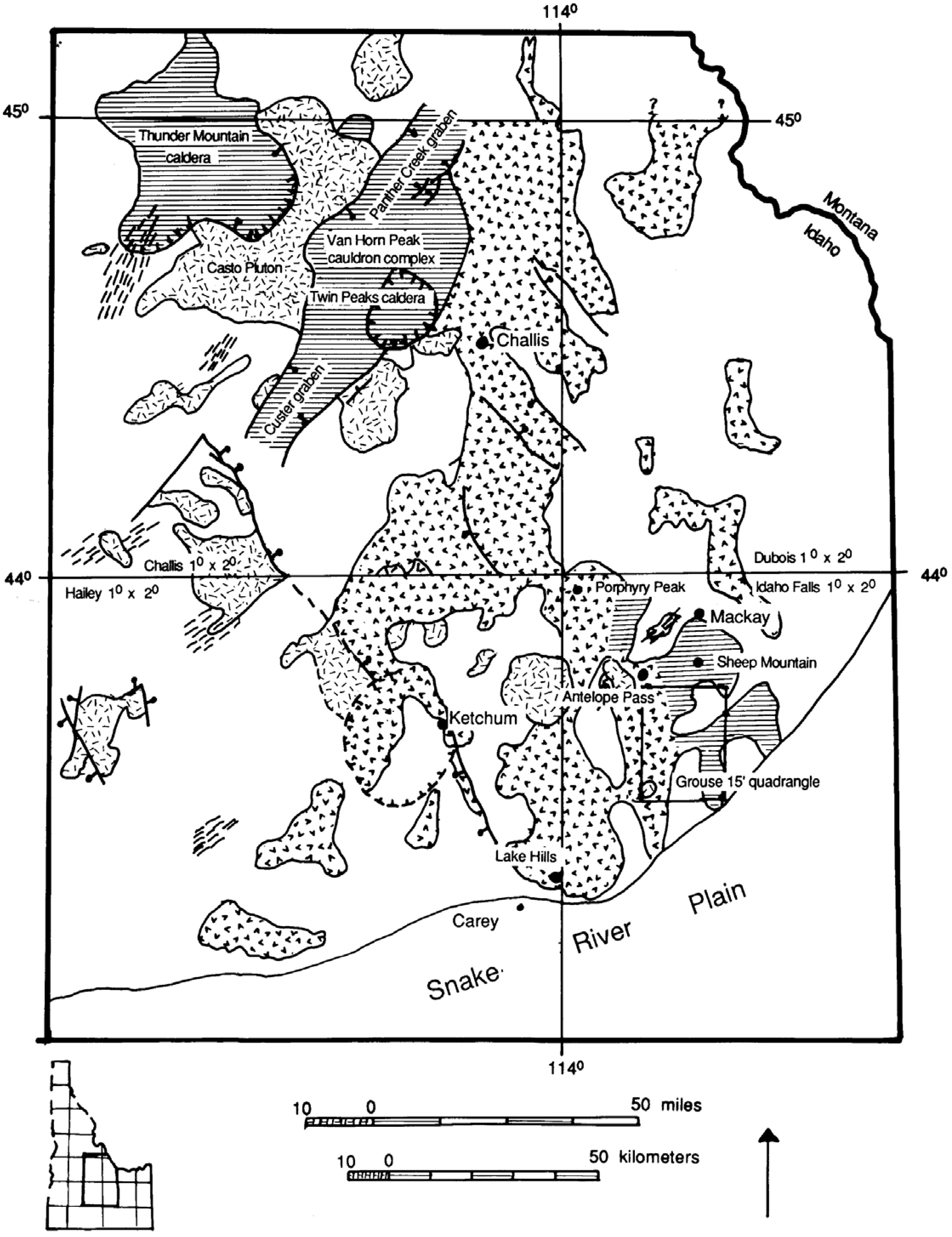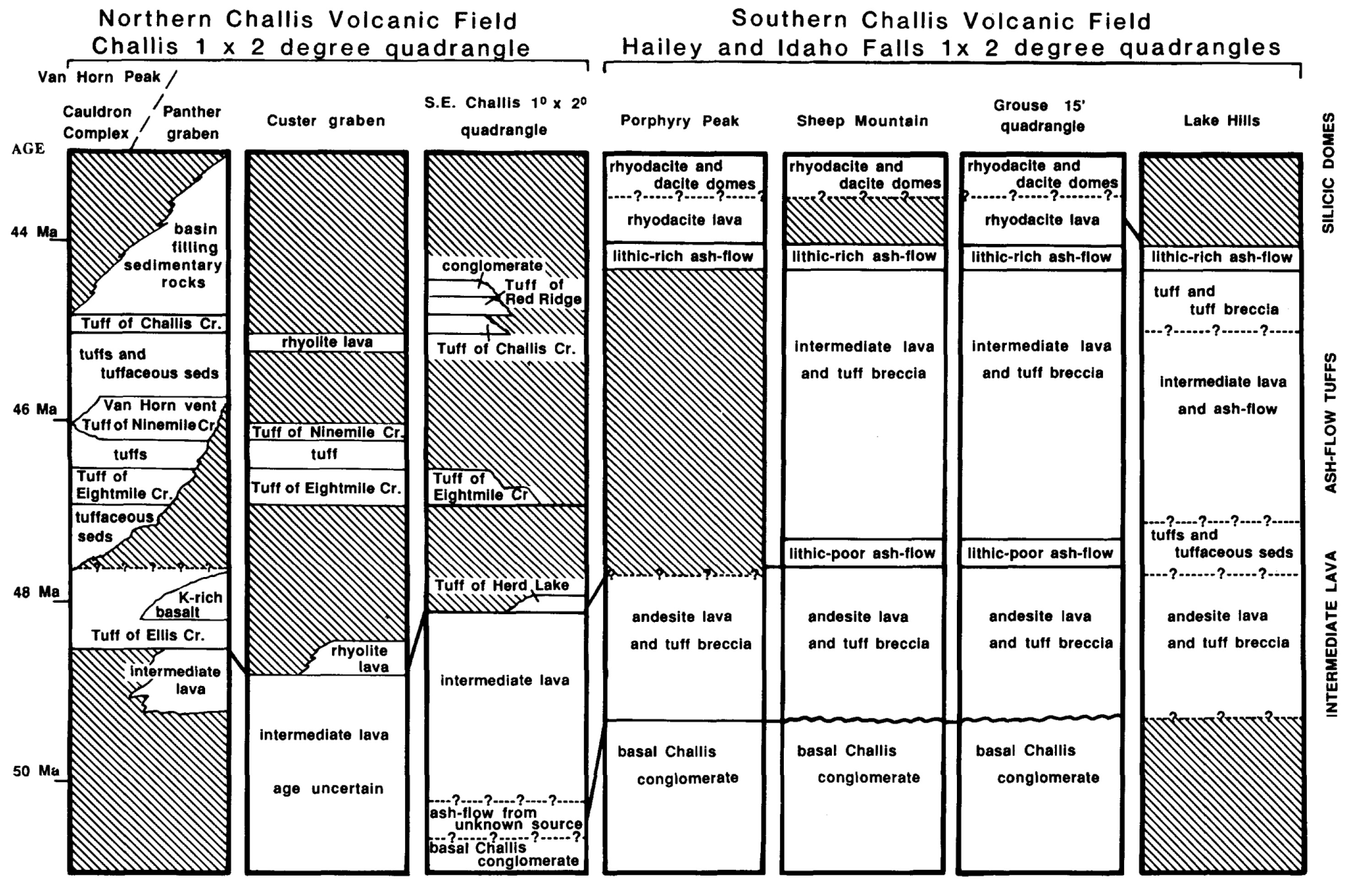 McIntyre, D. H., Ekren, E. B., and Hardyman, R. F., 1982, Stratigraphic and structural framework of the Challis Volcanics in the eastern half of the Challis 1 x 2 degree quadrangle, in Bonnichson, B. and Breckenridge, R. M., eds., Cenozoic Geology of Idaho: Idaho Bureau of Mines and Geology Bulletin 26, p. 3-22.