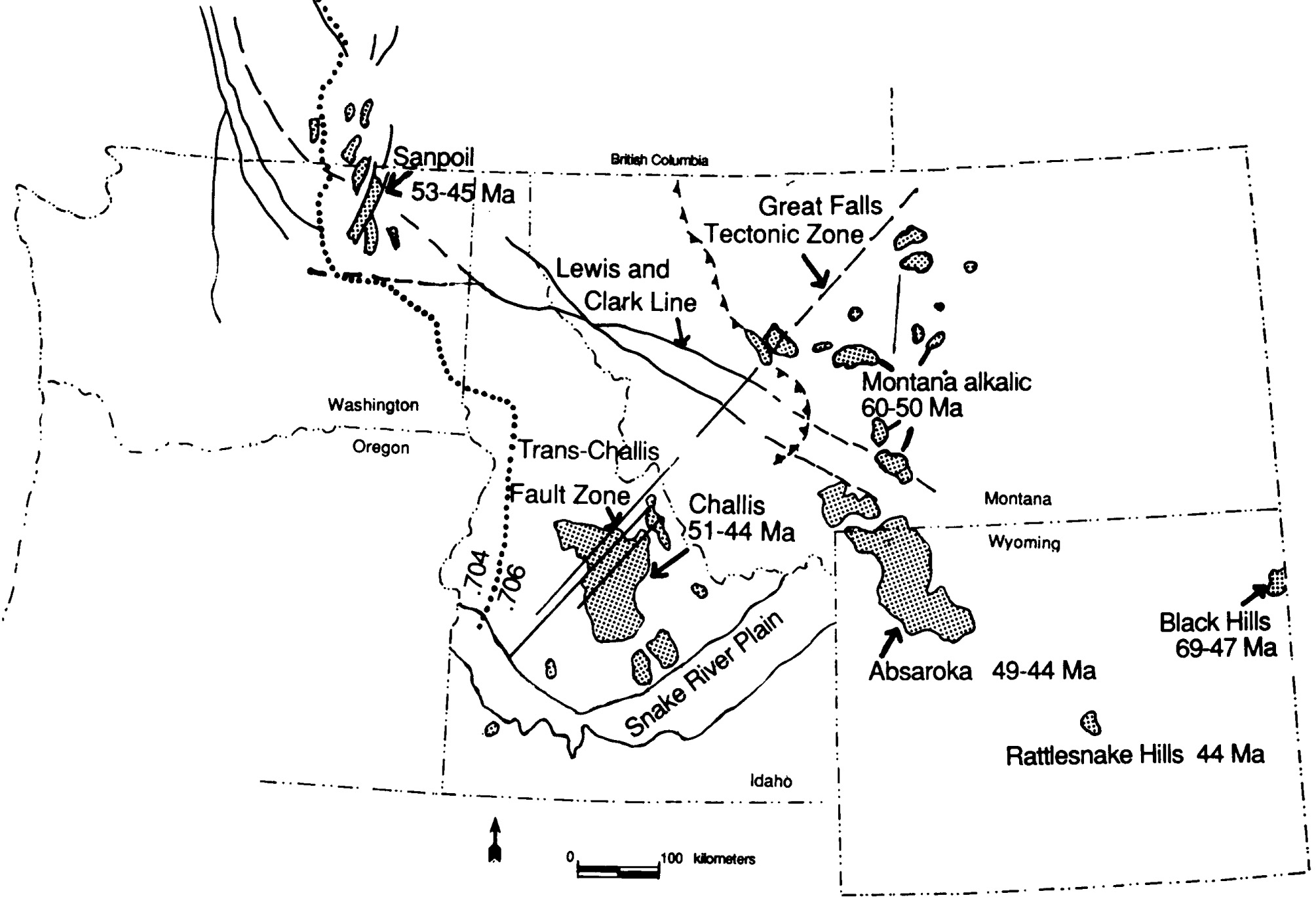 (Above) Eocene volcanic belt in the northwestern United States (from Moye et al., 1988). Major volcanic fields are labeled, showing approximate age span of most intense volcanism. Regional structures are shown in relation to distribution of volcanic fields; Trans-Challis fault zone is from Bennett (1986) and Great Falls tectonic zone is from O'Neill and Lopez (1985).