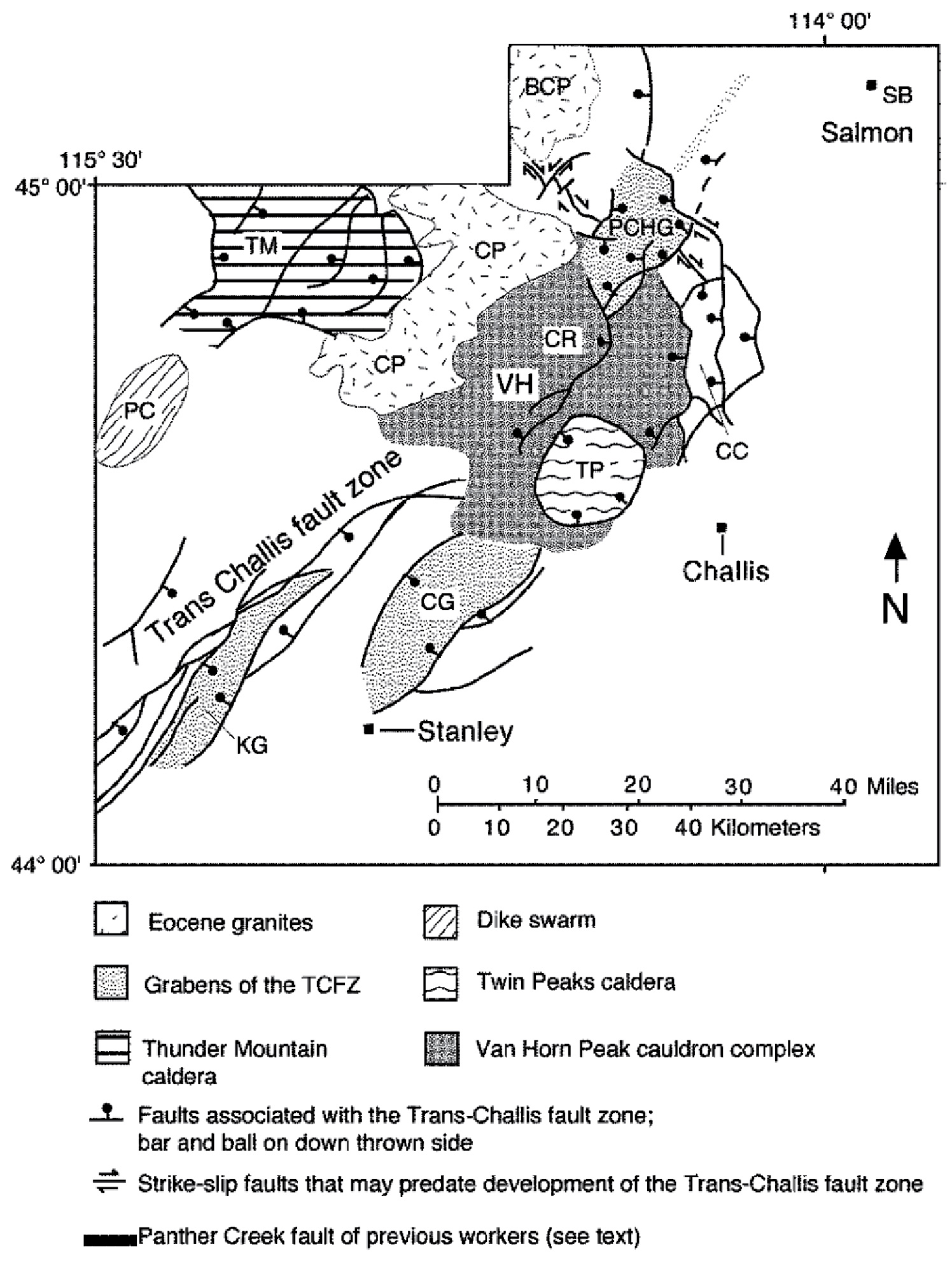(Right/Below) Map showing the linear graben that is related to the Trans-Challis fault zone. Regional map of the main calderas of the Challis Volcanic field, the Trans-Challis fault zone (TCFZ) and younger normal faults. BCP=Bighorn Crag pluton; CC=Corral Creek cauldron segment; CG=Custer graben; CP=Casto pluton, CR=Castle Rock cauldron segment; KG=Knapp Creek graben: PC=Pistol Creek dike swarm; PCHG=Panther Creek half graben; TM=Thunder Mountain cauldron complex; TP=Twin Peaks caldera: VH=Van Horn Peak cauldron complex. Sources: Shockey (1957); Bennett (1977); Harrison (1985); Ekren (1988); Janecke (1994); Evans and Connor (1993): Fisher et al. (1992); Janecke and Snee (1993); Modreski (1985) (From Link and Janecke, 1999).