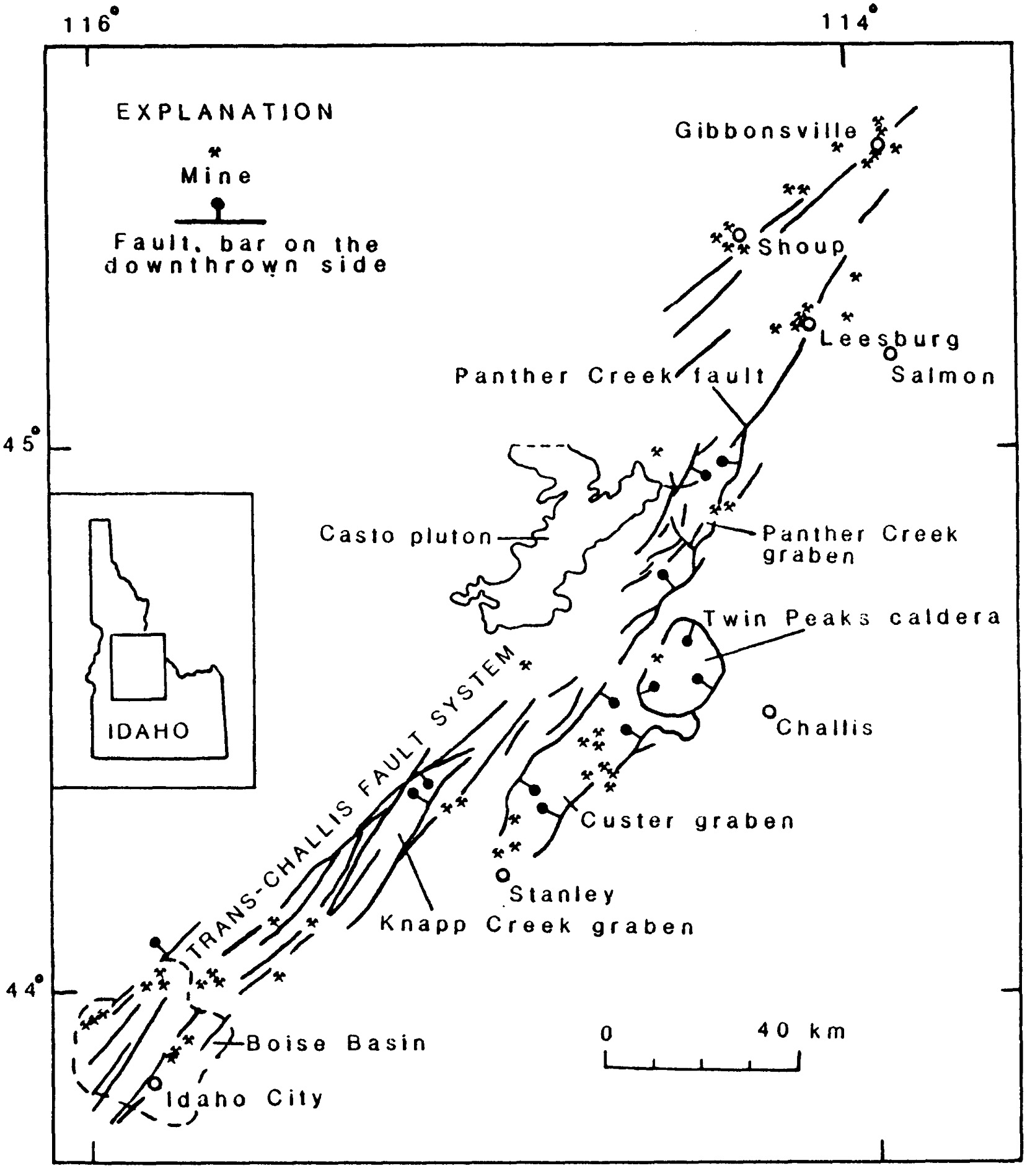 (Left/Above) Map showing the locations of productive gold and silver deposits, which have been mined along the trans-Challis fault zone (from Johnson et al., 1988).