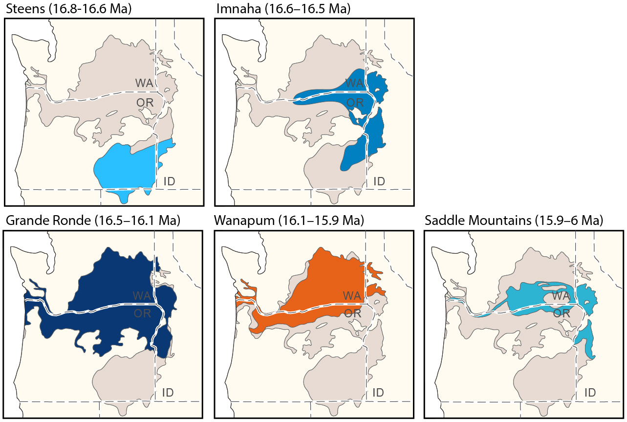 (Above) Maps of different eruptive epidodes of the Columbia River basalt (modified from Link et al., 2021).