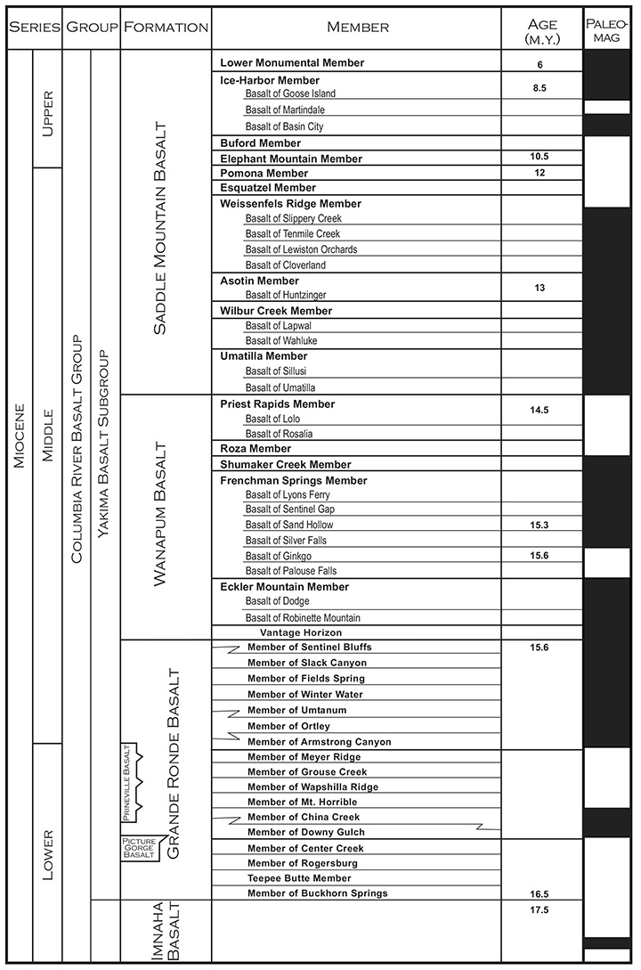 (Above) Stratigraphic column of the Columbia River Basalt. Paleomagnetic data in the right column: black areas indicate a time of normal magnetic polarity whereas white areas indicate a time of reverse polarity (modified from Reidel and others, 2003).