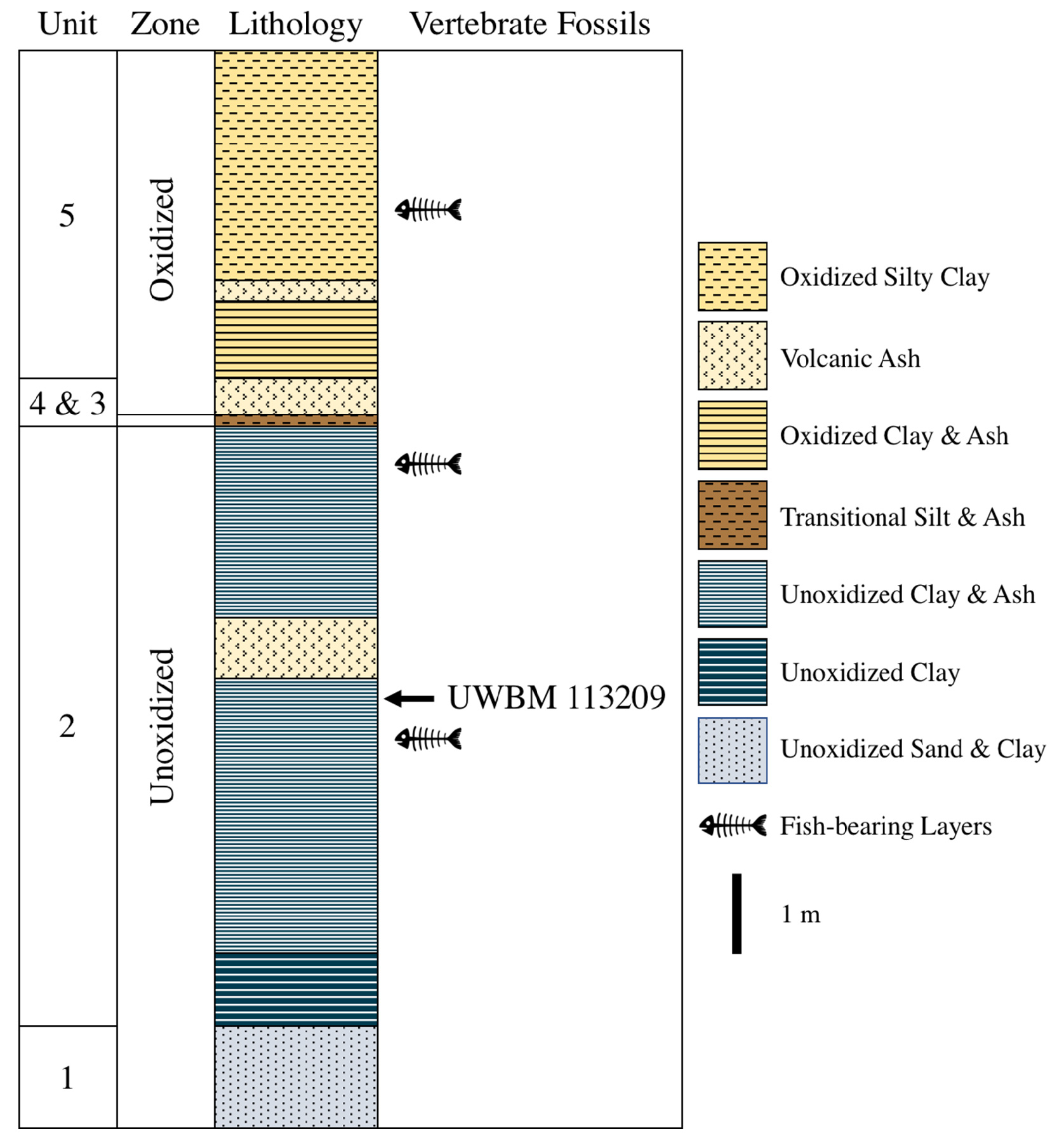 (Above) Stratigraphic column of the Latah Formation near the town of Clarkia in the Idaho panhandle (from Calede et al., 2018).