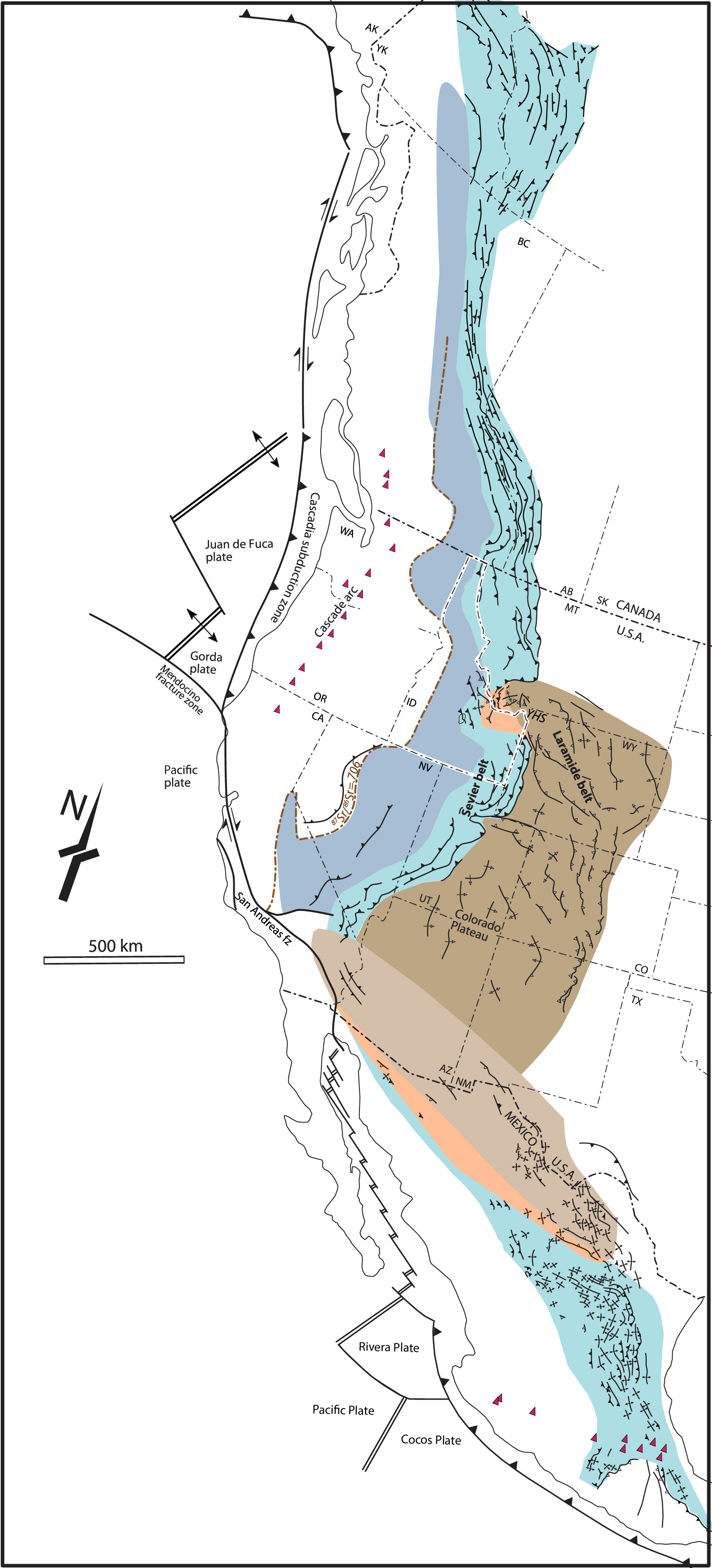 (Above) Simplified tectonic map showing the "expanded" Sevier-Laramide fold-thrust belts in the context of the North American Cordillera (modified from Yonkee and Weil, 2015 and Fitz Diaz et al., 2018).