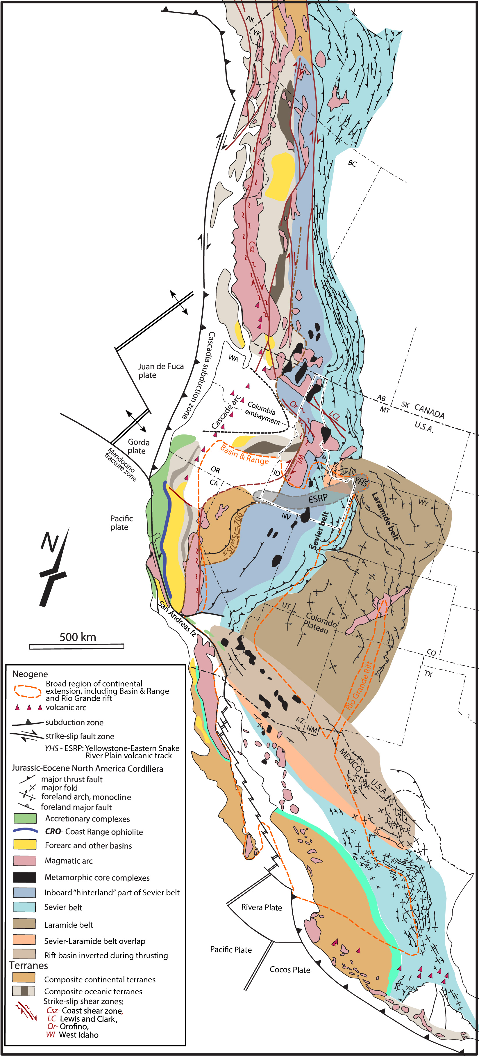 (Above) Tectonic map of the North American Cordillera showing major tectonic features (modified from Yonkee and Weil, 2015 and Fitz Diaz et al., 2018).