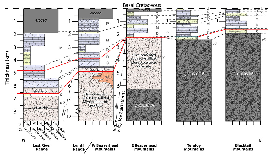 Within this part of the Sevier belt, the pre-thrusting Neoproterozoic to Early Ordovician rift and passive margin succession is largely missing. This likely limited the ability of the fold-thrust belt here to develop bedding-parallel, "thin-skinned" thrusts and resulted in a markedly different style and geometry of thrusting compared to the fold-thrust belt in southeastern Idaho. In east-central Idaho, thrusts carried Mesoproterozoic quartzite of the Belt Supergroup and in southwestern Montana, thrusts carried Archean and Paleoproterozoic crystalline basement rocks.