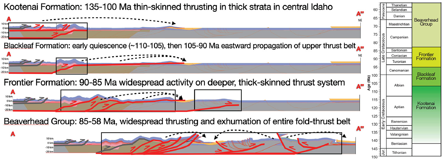 (Above) Preliminary cross sectional model of Idaho-Montana fold-thrust belt, showing timing of thrust activity based upon distinctive detritus in foreland basin strata (modified from Parker, 2021, Rosenblume, 2021; timing constraints from Garber et al., 2020; Finzel and Rosenblume, 2021; Rosenblume et al., 2021, 2022; Gardner, 2021).