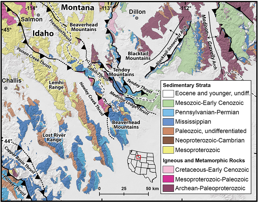 (Left) Regional geologic map showing the Idaho-Montana fold-thrust belt that spans from central Idaho (southwestern part of map) to southwestern Montana (northeastern part of map) (modified from Parker and Pearson, 2021).