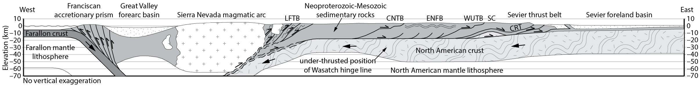 (Above) Schematic cross section across the ocean-continent subduction zone from outboard of California (left side of cross section), through Nevada and Utah (east side of cross section) (modified from Long, 2018).