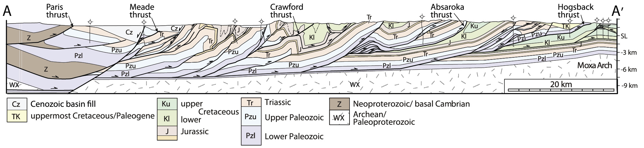 (Above) Cross section across a portion of the Wyoming salient showing major thrust faults (modified from Lamerson, 1982, Coogan, 1992, and Yonkee and Weil, 2015). Location of cross section is shown in above map.