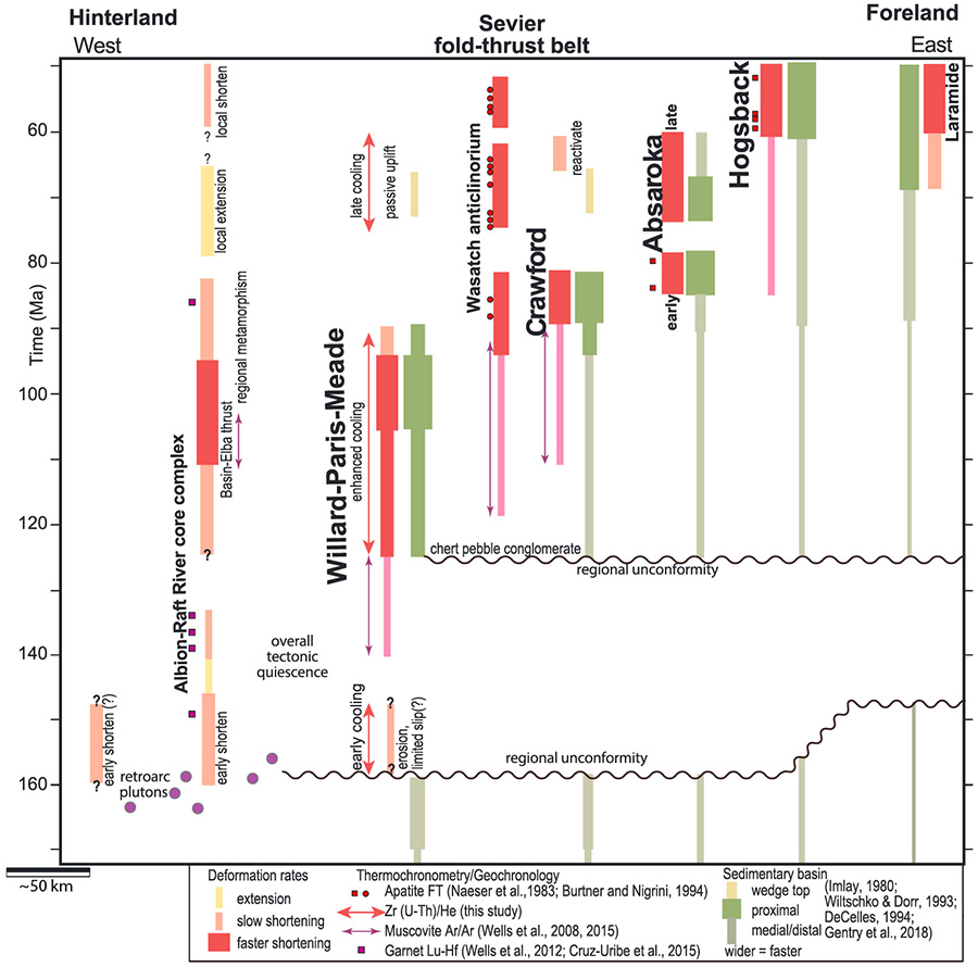 Yonkee, W.A., Eleogram, B., Wells, M.L., Stockli, D.F., Kelley, S., and Barber, D.E., 2019, Fault Slip and Exhumation History of the Willard Thrust Sheet, Sevier Fold‐Thrust Belt, Utah: Relations to Wedge Propagation, Hinterland Uplift, and Foreland Basin Sedimentation: Tectonics, p. 2018TC005444-58.