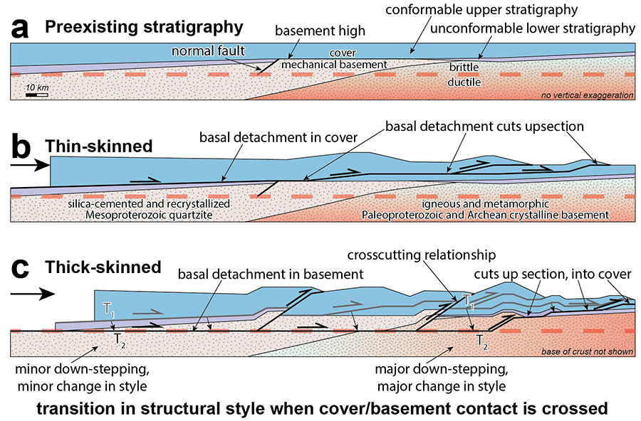 The thrust faults within much of the Sevier belt are "thin-skinned", meaning they are not very deep, and that their geometry flattens at depth and follows layers of weakness along bedding planes in Paleozoic and Proterozoic strata. For the most part, these thrusts did not deform crystalline basement rocks of the Wyoming craton, unlike "thick-skinned" thrusts of the Laramide belt, which carried basement rocks with a very thin sedimentary cover.