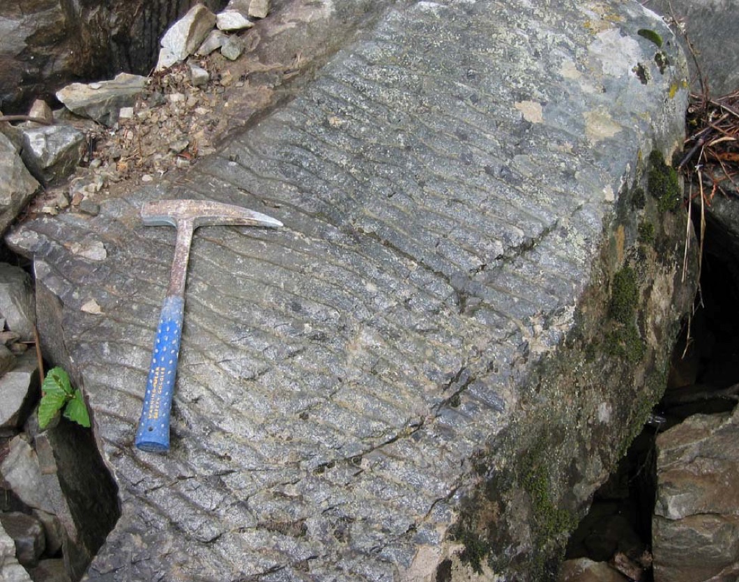 (Above) Close-up of ripple marks in quartzite from outcrop with foreset bedding, Palouse River, Highway 2, Bonner County (Jim Cash photo).