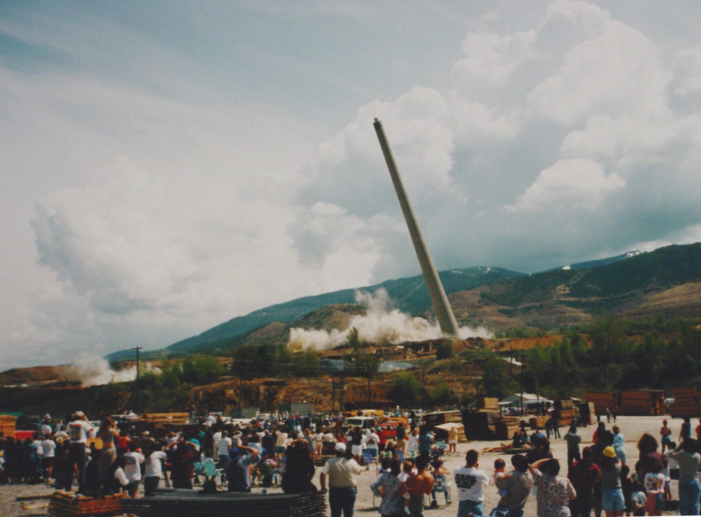 (Above) On May 26, 1996, the smoke stacks for the smelter and the zinc plant were dropped into trenches and buried (E.H. Bennett photograph).