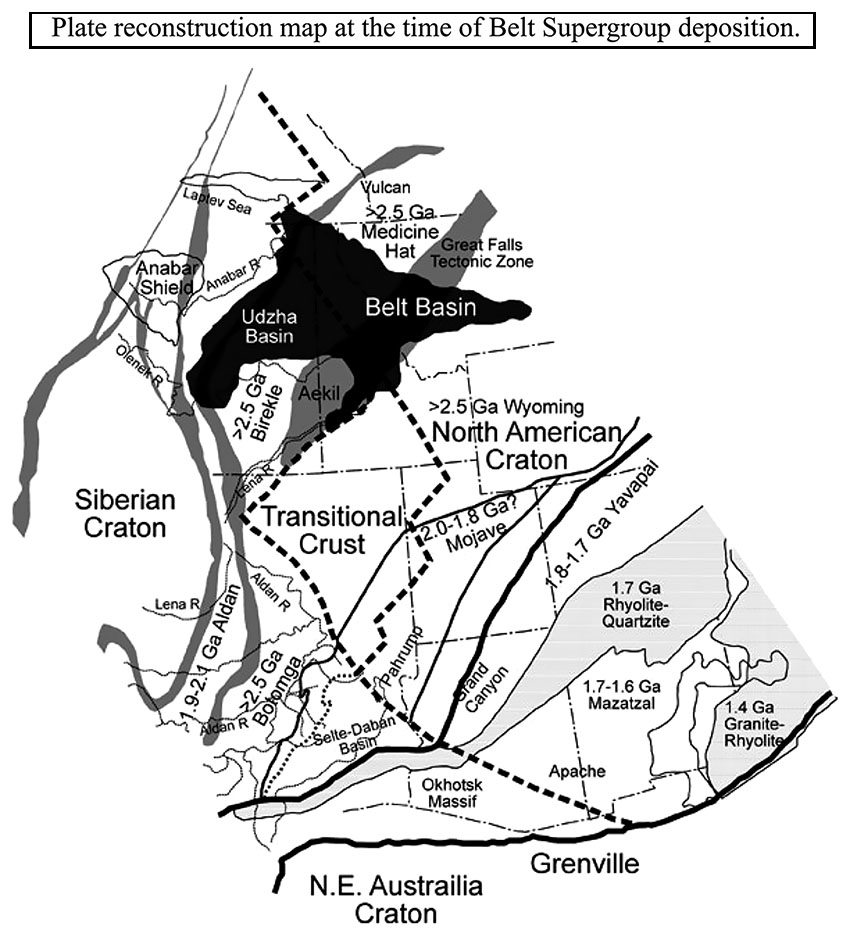 (Left/Above) Regional map showing plate reconstruction at the time of Belt Supergroup deposition (modified from Sears). The Hearne/Medicine Hat Province (northern extent of figure) is ~2.5 Ga basement with the same age basement material found in the Spokane dome region of the core complex (Doughty et al., 1997).