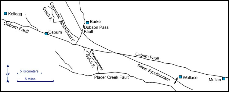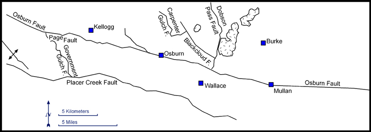 (Above) Map showing locations of some of the faults in the Coeur d’Alene district. Circles, diamonds, and triangles mark the locations of most of the mines that have produced ore (Bennett, 1984). The Lewis and Clark shear zone is a 50 km wide, structurally and topographically defined lineament that crosses the Belt Supergroup and extends for at least 300 km. The zone includes the Placer Creek fault and the Osburn fault.
