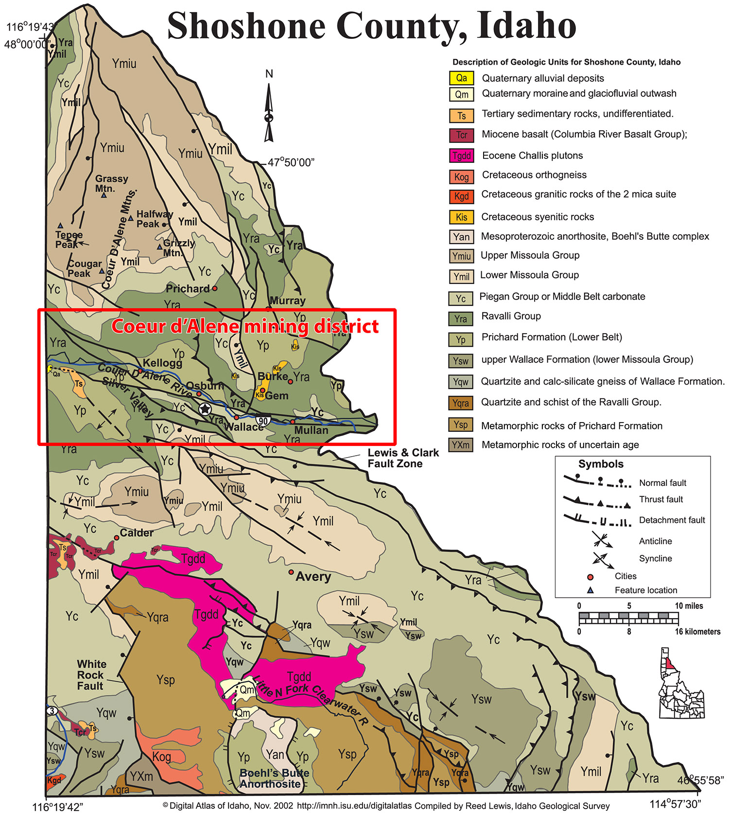 (Above) Generalized geology of the Coeur d’Alene district (modified from Lewis, 2002 Digital Atlas of Idaho).