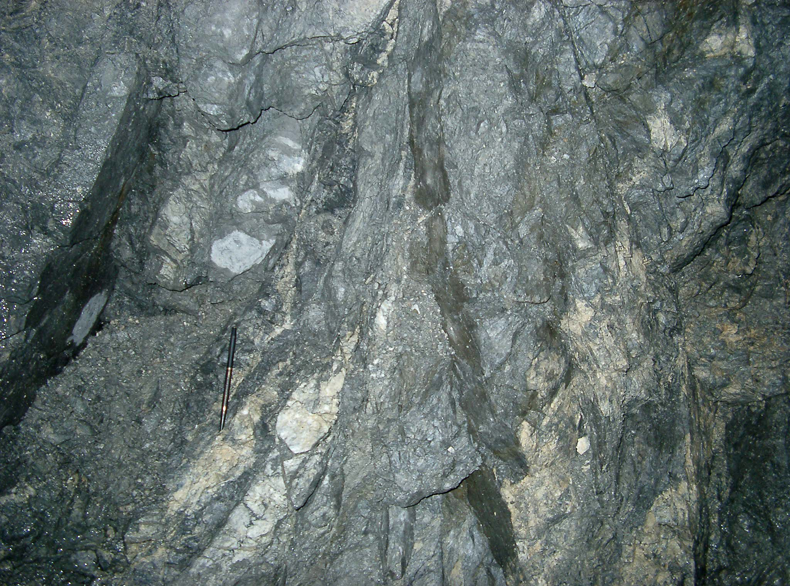 (Above) Underground vein in the Galena mine. (V.S. Gillerman photograph, 2003). Most of the ore bearing veins occupy one of three stratigraphic horizons. (Figure 11) The Prichard Formation near the middle quartzite (zinc-rich deposits), the Prichard Burke transition zone (lead-zinc-rich deposits), company built its own smelter in 1917 and an electrolytic zinc plant (with and Revett St. Regis transition zone (lead-silver-copper-rich deposits (Bennett, 1984).