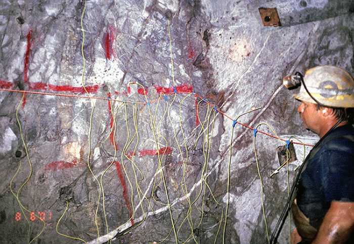 (Above) A loaded face at the Galena mine prior to being blasted (area where mine excavation is advancing). Large mucking machines are used to remove the rock after each blast.