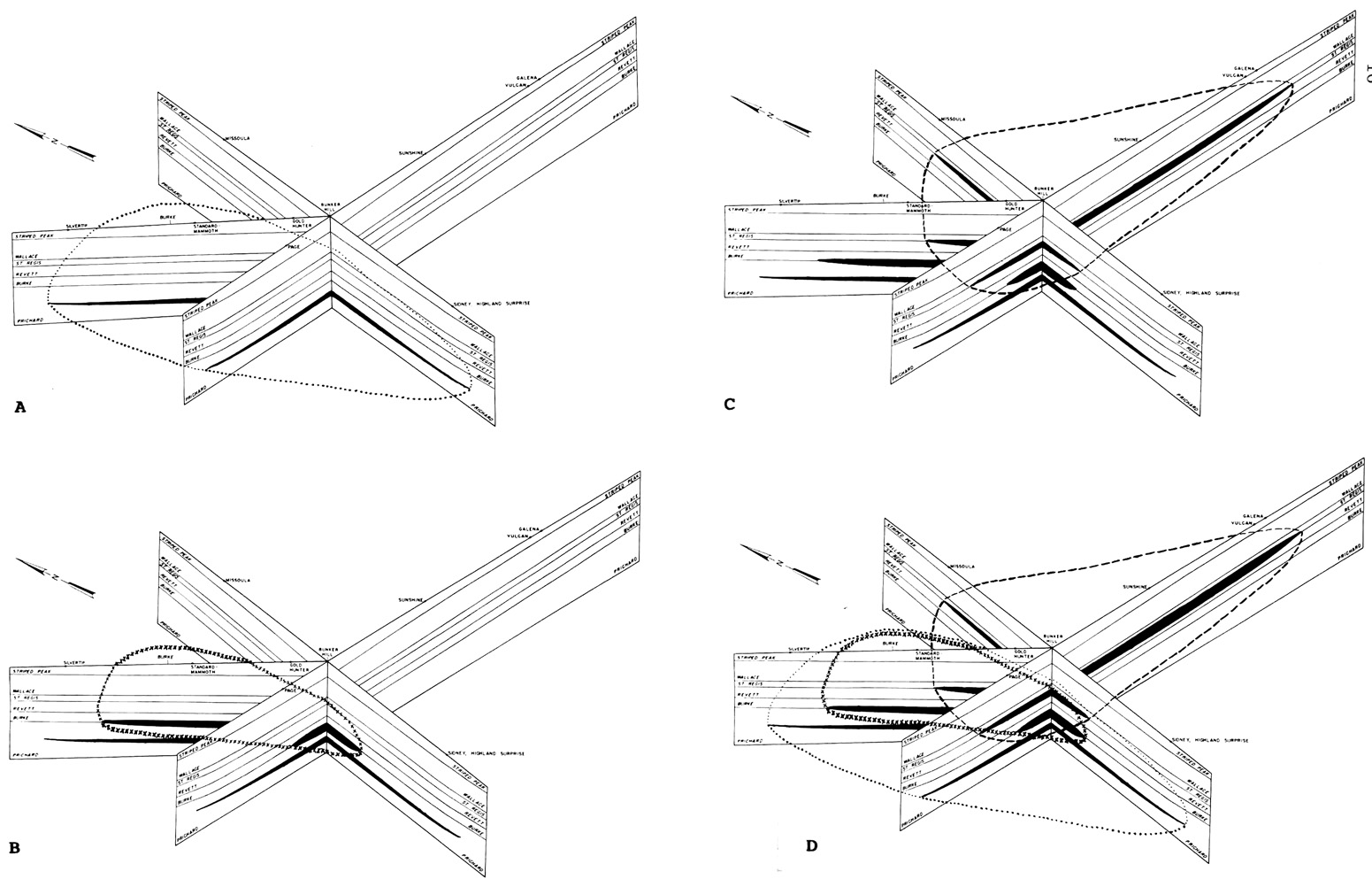 (Above) Diagram showing mineralized horizons in the Coeur d'Alene district (Bennett, 1984). Mineralization shown in black. (A) Generalized outline of the Middle Prichard basin, prefolding and faulting. (B) Generalized outline of the Prichard-Burke basin, prefolding and faulting. (C) Generalized outline of the Revett-St. Regis basin, prefolding and faulting. (D) Generalized outline of the Middle Prichard, Prichard-Burke, and Revett-St. Regis basins, prefolding and faulting.
