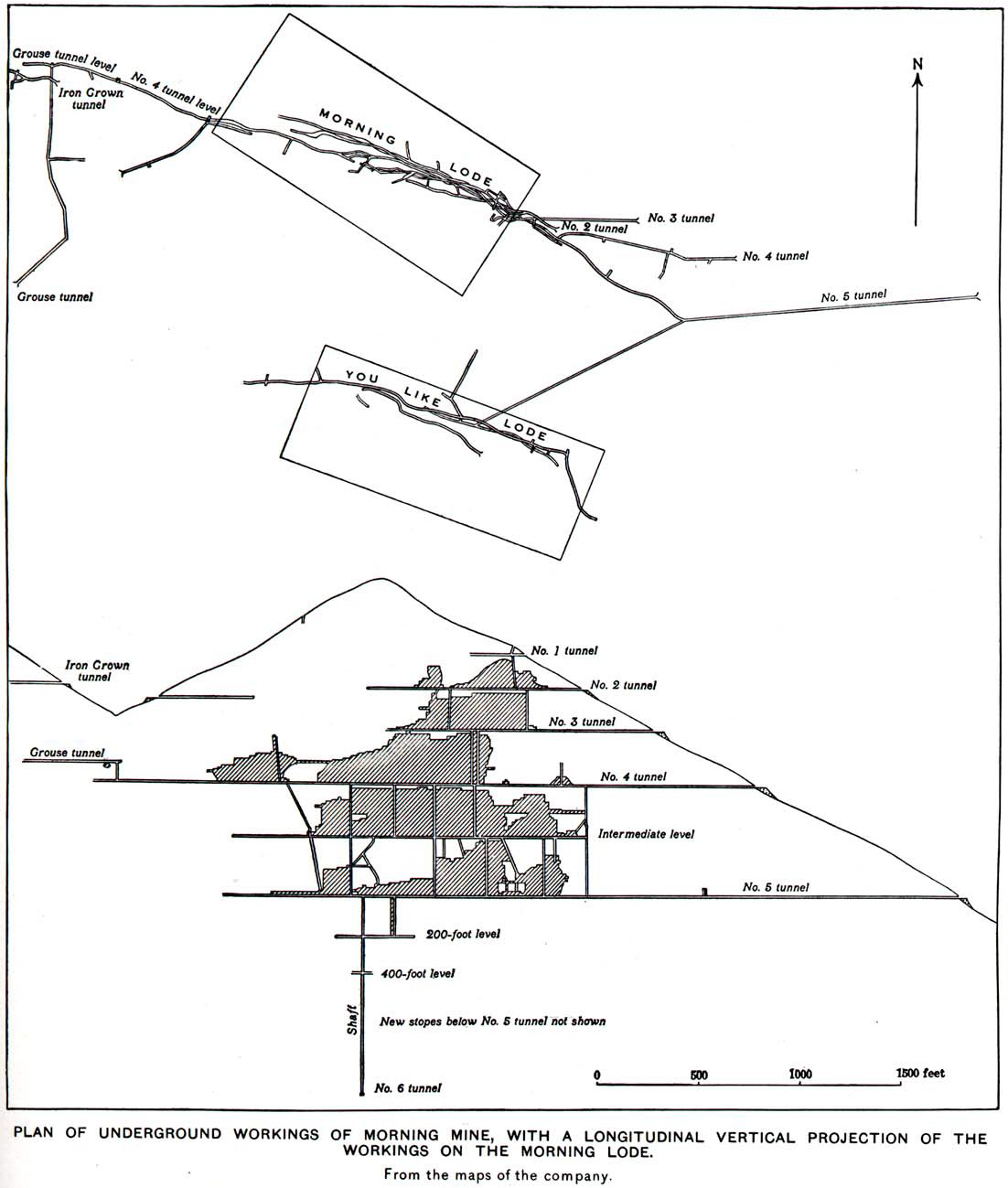 (Above) Plan and longitudinal vertical projection of the workings of the Morning Mine, circa 1908 (Ransome and Calkins, 1908).