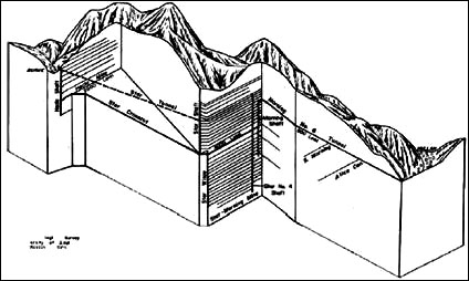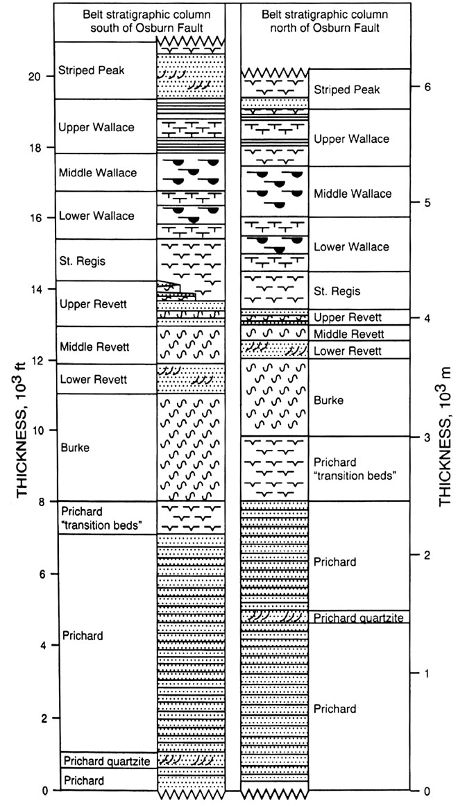 (Right/below) Stratigraphic column of the Belt Supergroup in the Coeur d’Alene district (Winston, 2000). The mines of the Coeur d’Alene district are hosted by the Proterozoic Belt Supergroup (see Module 2) that is about 1.4 billion years old. Most of the ore is in the Revett-St. Regis transition zone, the Prichard-Burke transition zone, and the middle Prichard Formation quartzite (Bennett, et. al, 1989; Winston, 2000).