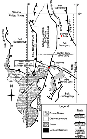 (Above) Geologic map of Priest River core complex in northern Idaho (adapted from Doughty et al., 1997; Doughty and Price, 2000).