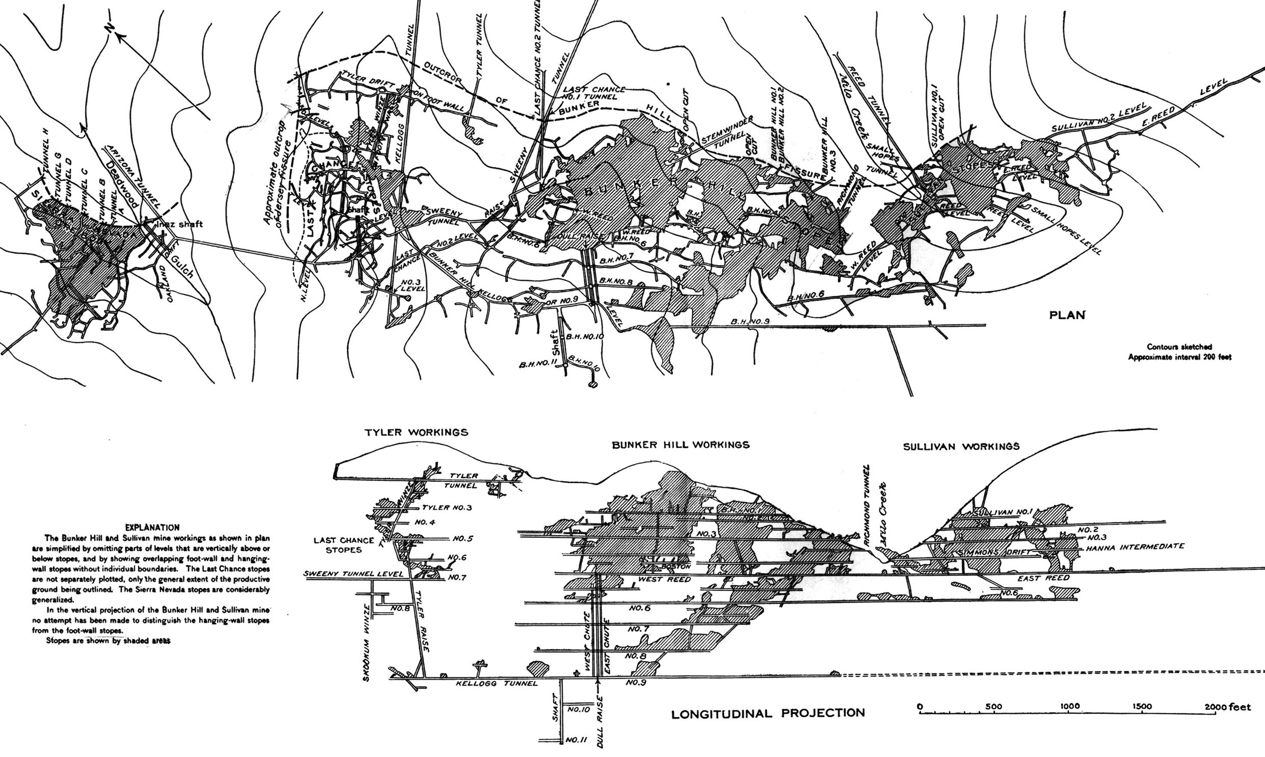 The Bunker Hill Mine was discovered in 1885. In 1887 Simeon Reed, a Portland Oregon businessman, purchased the mine and formed the Bunker Hill Mining and Concentrating Company. In 1903, the 2-mile-long Kellogg tunnel was completed, and the huge March ore body was discovered in 1904. Figure 20 shows the extent of the upper workings in 1908 or a little earlier. The company built its own smelter in 1917 and an electrolytic zinc plant (with Hecla Mining Company) in 1928.