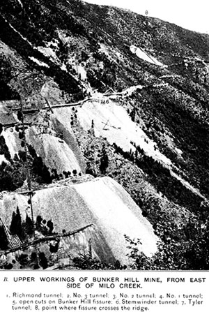 (Above) Historical photo of upper workings of Bunker Hill Mine, taken from east side of Milo Creek.