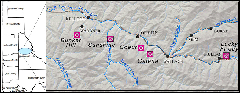 (Above) Map of the Coeur d'Alene mining district, with some of the major mines labeled.