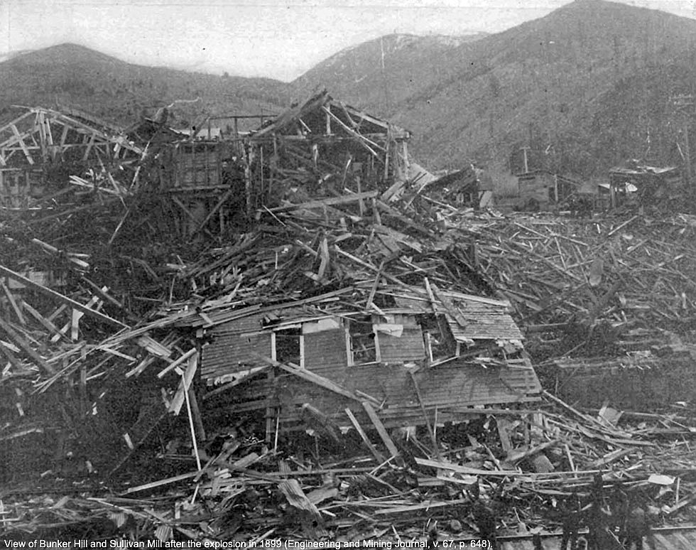 (Right/Below) Bunker Hill mill following explosion in 1899. (Engineering and Mining Journal, v. 67, p. 648).