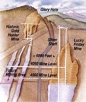 (Right/Below) Diagram of the Gold Hunter and Lucky Friday workings.