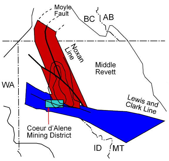 (Left/Above) Sketch map showing location of the Coeur d'Alene district in relation to the Noxon arch (Noxon line) and the faults of the Lewis and Clark shear zone (White, 2000). The structural geology of the area is complicated by a variety of folds and faults of diverse ages and movements. The district is at the intersection of the west-northwest-striking Osburn fault and a north-trending anticlinal uplift called the Noxon arch (White, 2000).