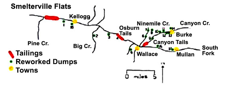 (Above) Location of tailings dams and of dumps reworked for additional metals in the Coeur d'Alene district (Bennett, 2006).