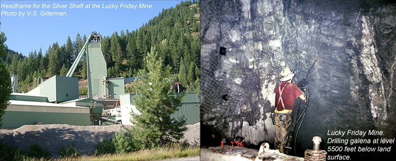 (Above) Headframe for the Silver Shaft at the Lucky Friday Mine (V.S. Gillerman photograph, 2005). Miner drilling vein at the 5500 level (feet below land surface) in the Lucky Friday Mine (V.S. Gillerman photograph, 1996).