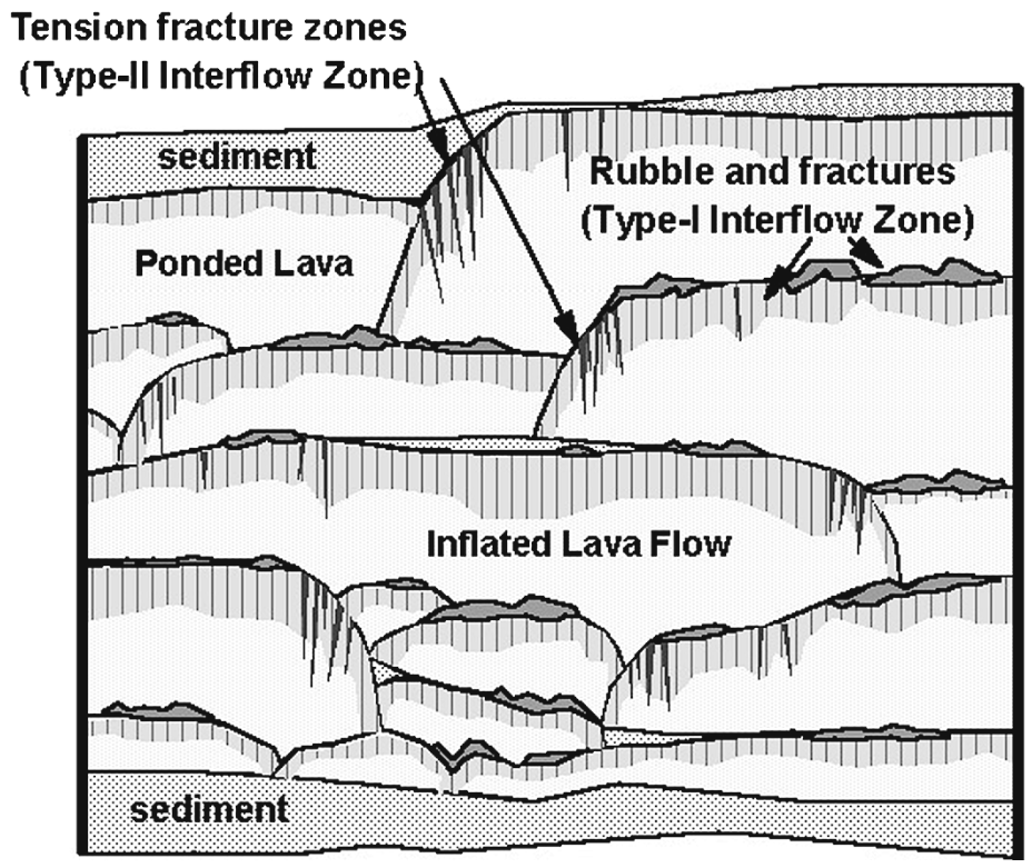 (Above) Conceptual model of eastern Snake River Plain aquifer stratigraphy, showing stacked pahoehoe lava flows, interflow zones, and sedimentary interbeds (from Welhan et al., 2002).