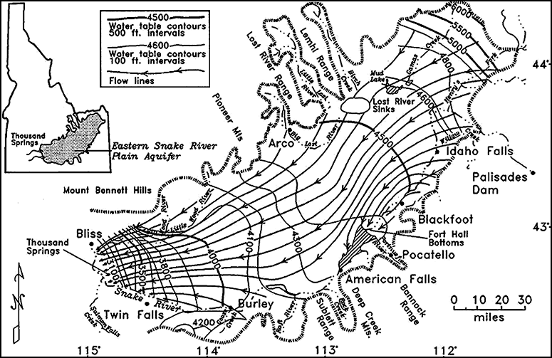 (Right/Below) Flow directions and aquifer elevations for entire Snake River Plain Aquifer. Note western Aquifer and flow into Snake River, Boise River , and overall west-northwestward flow. From the U. S. Geological Website, http://pubs.usgs.gov/ha/ha730/ch_h/H-Snake_River1.html