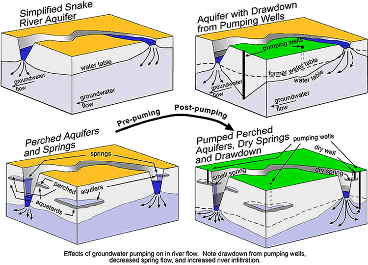 (Above) Pre-pumping and post-pumping and effects on aquifers.