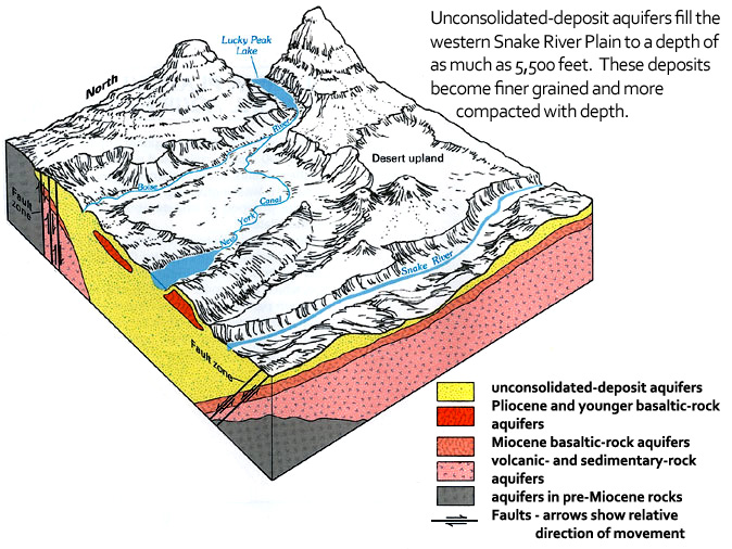 (Left/Above) Generalized cross-section of the sediments underlying the western Snake River Plain, near the Boise area. From Idaho Department of Water Resources, Treasure Valley Hydrology.