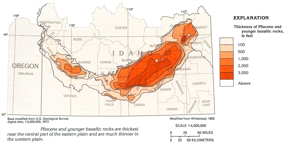 (Left/Above) Map showing thickness of basalts in the Snake River Plain. From http://pubs.usgs.gov/ha/ha730/ch_h/H-Snake_River1.html