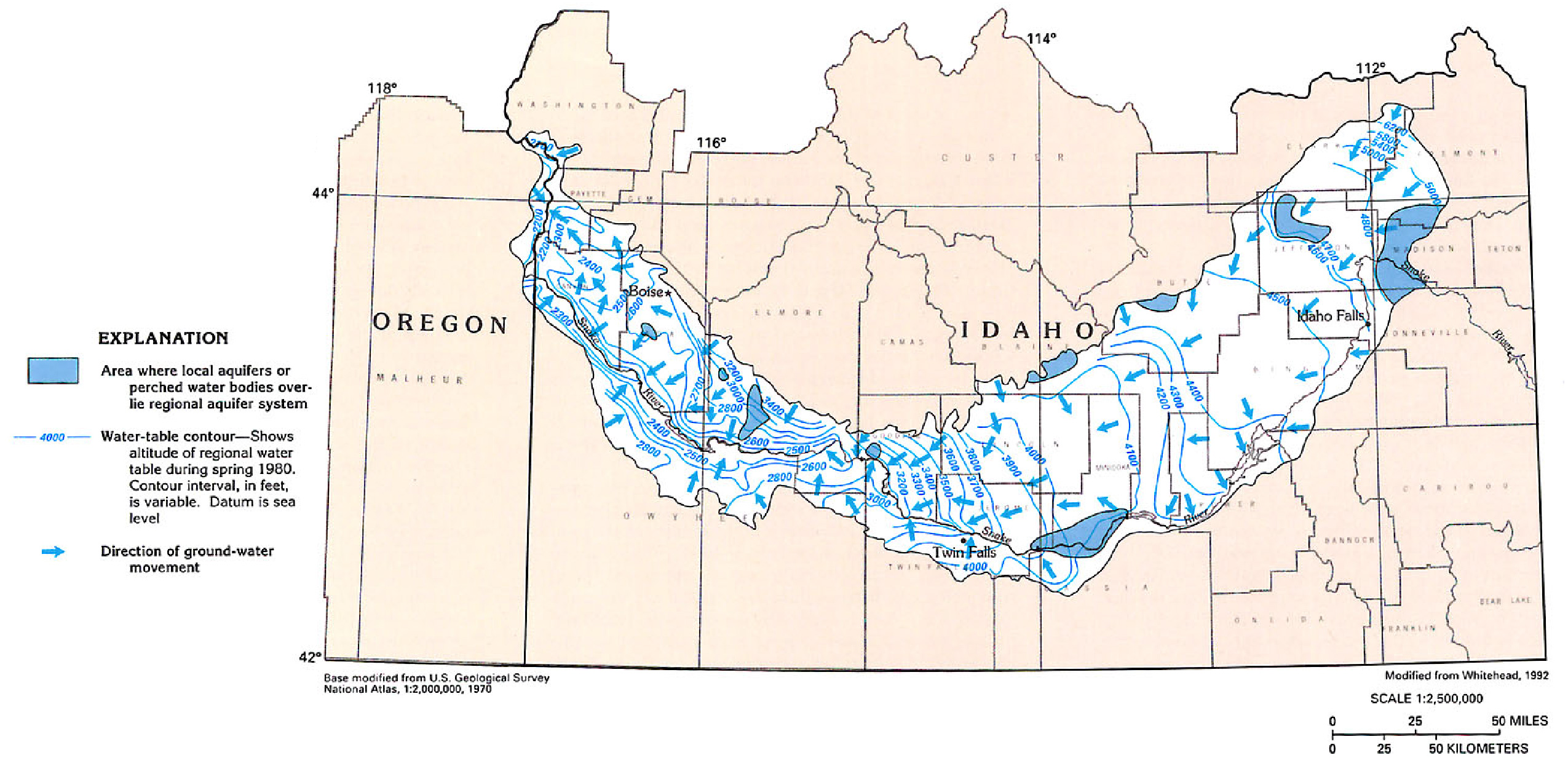Lindholm, G.F., Garabedian, S.P., Newton, G.D., and Whitehead, R.L., 1987, Configuration of the water table and depth to water, spring 1980, water level fluctuations, and water movement in the Snake River Plain regional aquifer system, Idaho and eastern Oregon: U.S. Geological Survey Hydrologic Investigations Atlas HA-703, scale 1:500,000, 1 sheet.