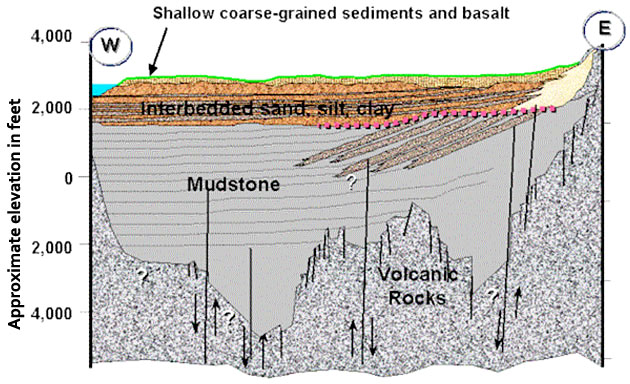(Above) West to east (from right to left) cross section along the axis of the eastern Snake River Plain, showing the possible saturation zone of the aquifer. From the Digital Atlas of Idaho.