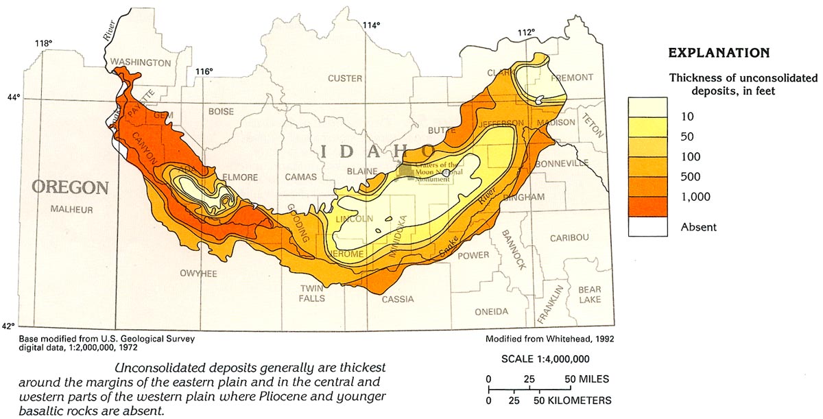 (Left/Above) Map showing the thickness of unconsolidated sediments in the Snake River Plain. From http://pubs.usgs.gov/ha/ha730/ch_h/H-Snake_River1.html