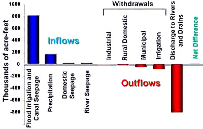 Human activity has had a tremendous impact on the water balance of the eastern aquifer. About sixty percent of total recharge to the aquifer is derived from irrigation with surface water. Most groundwater still leaves the aquifer via springs and seepage losses in two major upper basin reaches, although pumping withdrawals contribute significantly to the aquifer's total losses.