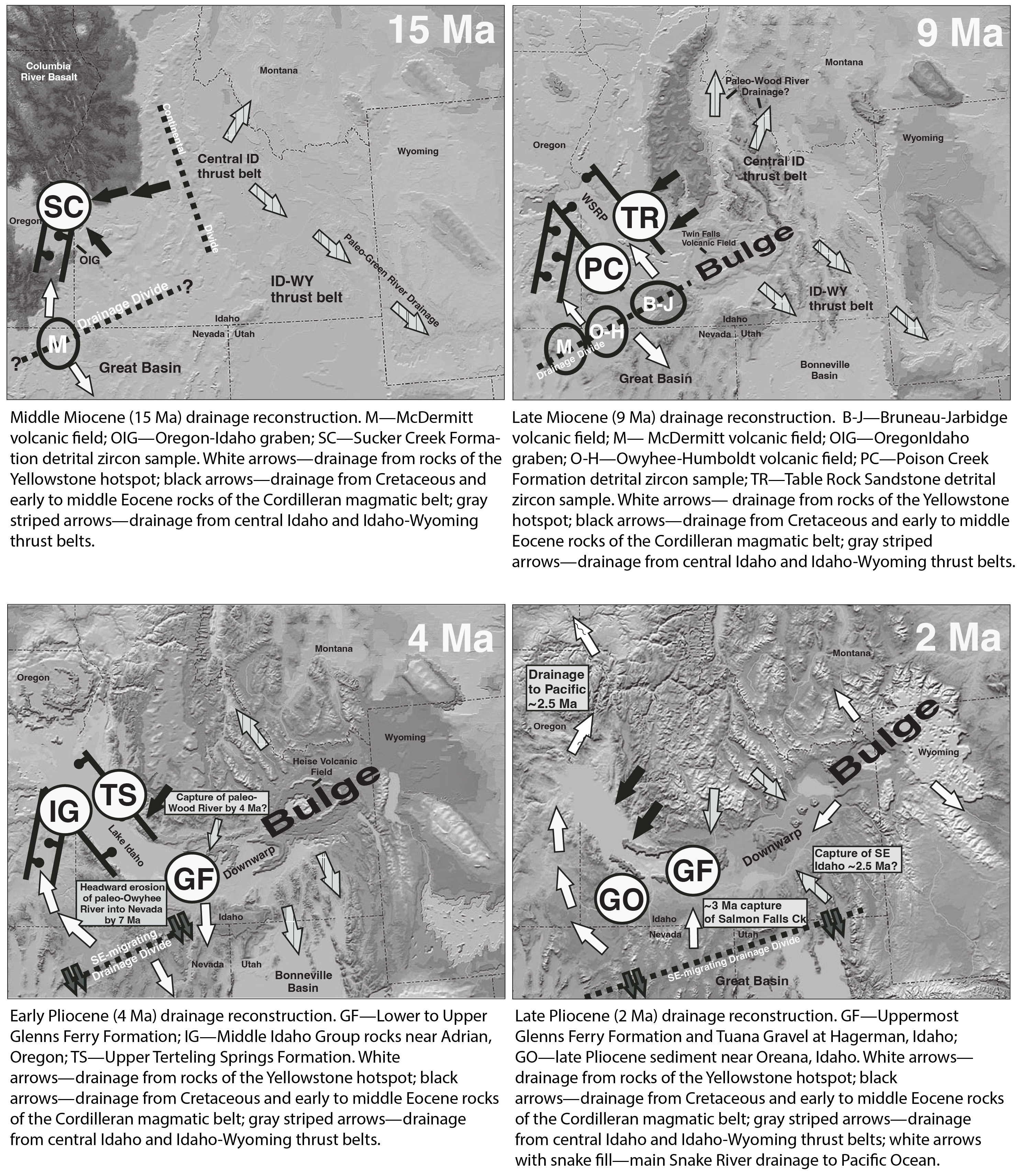 (Above) Topographic and drainage evolution of the ESRP-Yellowstone system (modified from Link et al., 1999 and Beranek et al., 2006).