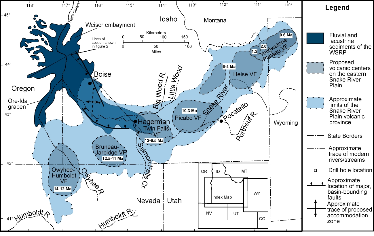 Further information about the Yellowstone-eastern Snake River Plain can be found in the Digital Atlas of Idaho: Snake River Plain page and Rocks, Rails, and Trails page.