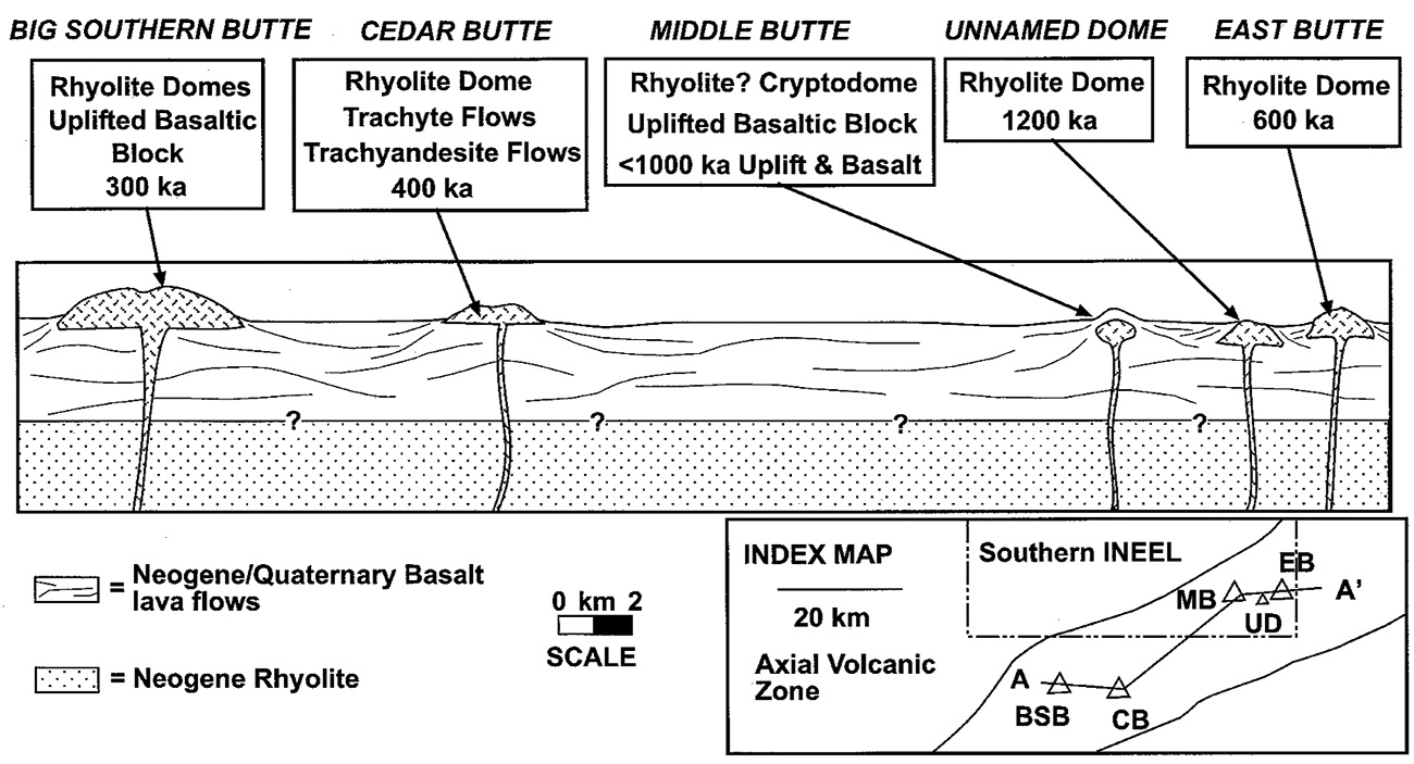 (Left/Above) Relative locations of the five major rhyolite domes ("buttes") on the ESRP (from Hughes et al., 1999). From south to north, these are Big Southern Butte, Cedar Butte, Middle Butte, Unnamed Butte, and East Butte. They are located near the extinct Picabo and Heise volcanic centers but are not directly associated with Yellowstone hotspot volcanism.